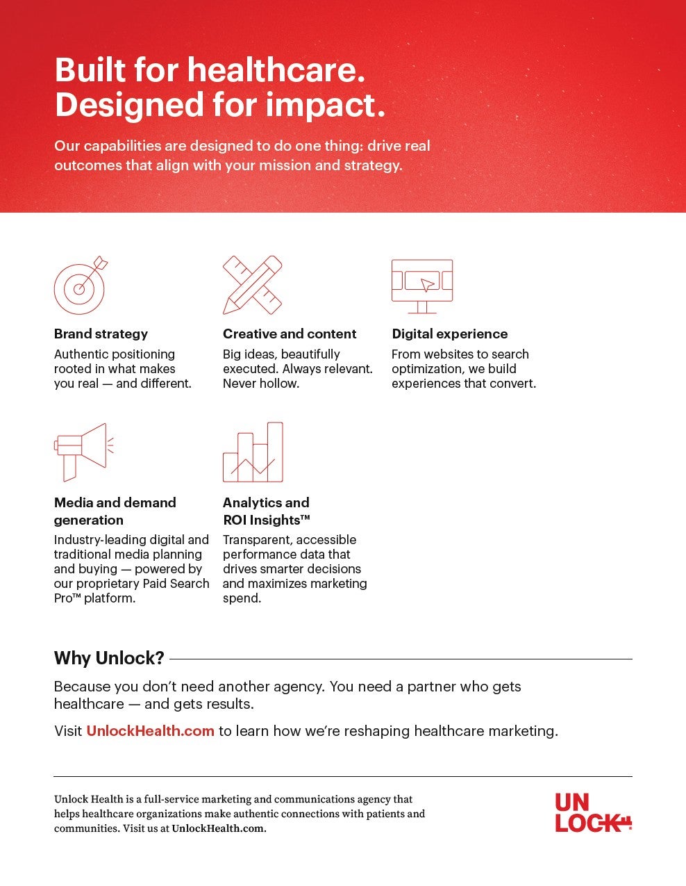Visit UnlockHealth.com to learn more about our industry-leading services and how we’re shaping the future of healthcare marketing