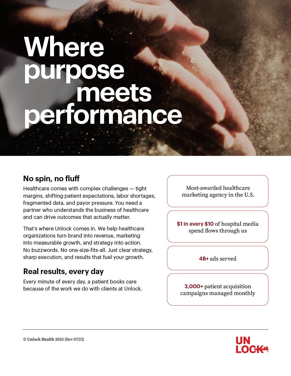 Unlock Health is a full-service marketing communications agency that helps healthcare organizations make authentic connections with patients and communities. As the largest agency in the nation serving healthcare providers, Unlock manages more than 3,000 patient acquisition campaigns every month. We work with the most prestigious health systems and provider groups to build brands, integrate marketing tech, and transform digital experiences. Unlock handles nearly one dollar in every ten spent on media by hospitals and health systems. Every minute of every day of the year, a patient books an appointment for needed care as a result of Unlock’s work.
