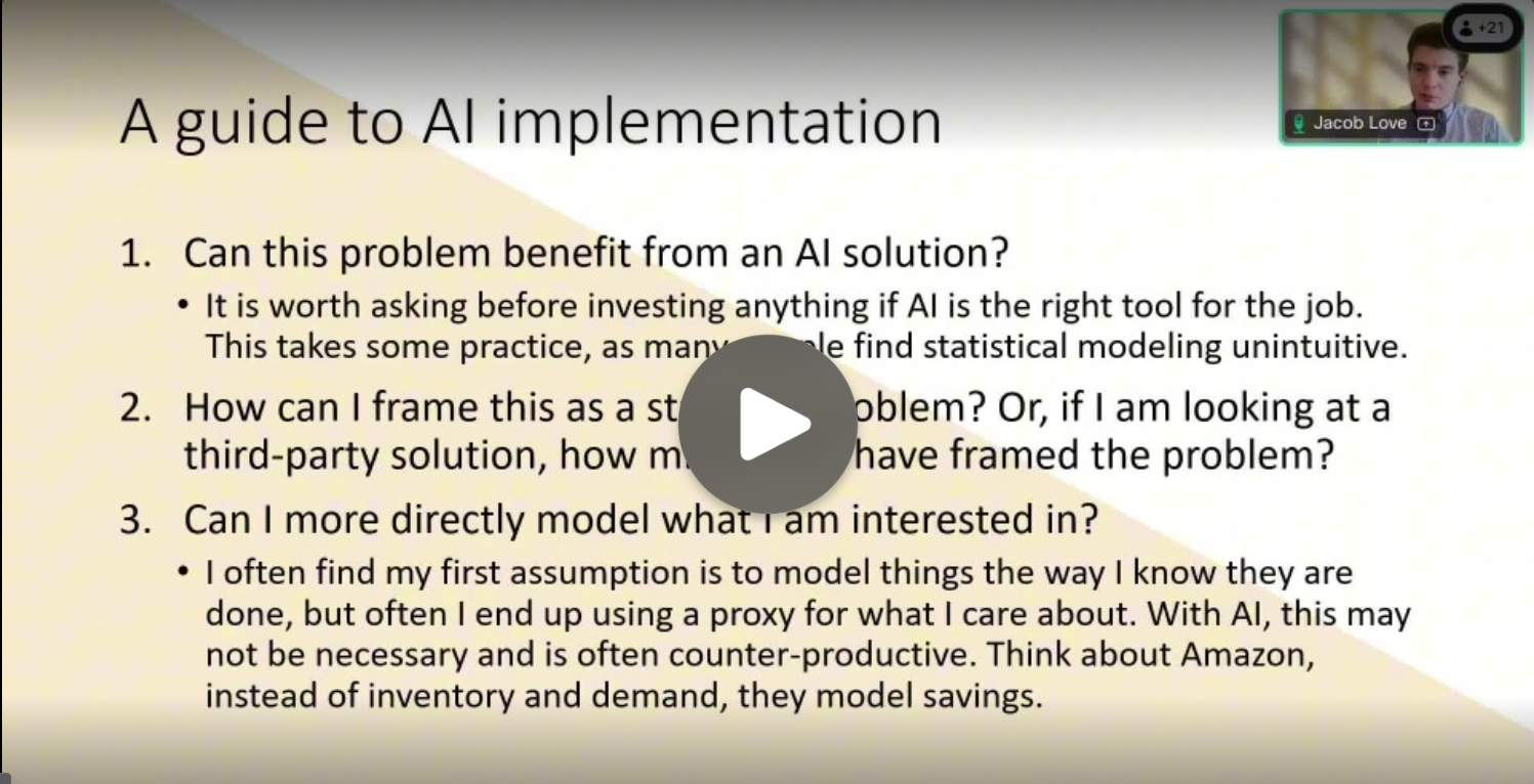 From the session, "The Future of AI in Health Care Strategy", speaker Jacob Love provides an 8-step guide to AI implementation.